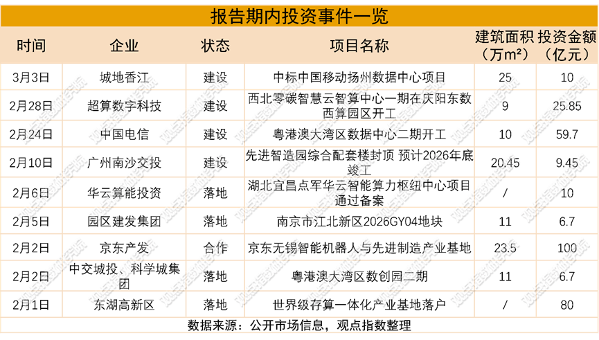 观点指数 在3月27日观点指数研究院发布的《智能经济 | 2026年2-3月产业园区暨基础设施投资发展报告》中,其指出智能经济成为国家战略层面的核心发力点,多地签约超1675亿元产业项目,各类市场主体加大产业投资力度,重点布局机器人全产业链及存储与智算一体化领域。京东、中交城投等企业纷纷落地机器人相关产业基地与园区载体。