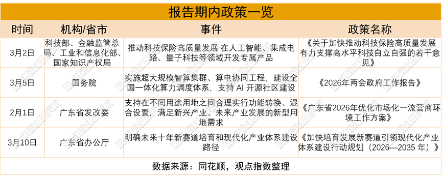 报告期内,据观点指数不完全统计,共录得4起政策动态。其中,政府工作报告首次明确提出打造智能经济新形态,将人工智能、算力基础设施、智能终端与智能体推广置于战略地位,构建全方位政策支撑体系,激发产业市场主体活力。